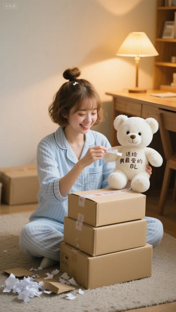 亚麻色微卷短发松松扎成丸子头,发梢沾着刚拆快递时蹭的碎纸屑。美少女穿着淡蓝条纹睡衣盘腿坐在地毯上,面前堆着三个拆到一半的快递盒。她右手捏着一只圆滚滚的奶白色毛绒熊的耳朵,左手正撕最后一张胶带——熊肚皮上缝着歪歪扭扭的“送给我最爱的BL”(BL是她名字的缩写)。暖黄台灯从书桌斜照过来,在她睫毛下投出扇形阴影,嘴角的笑意比熊的耳朵还软乎。