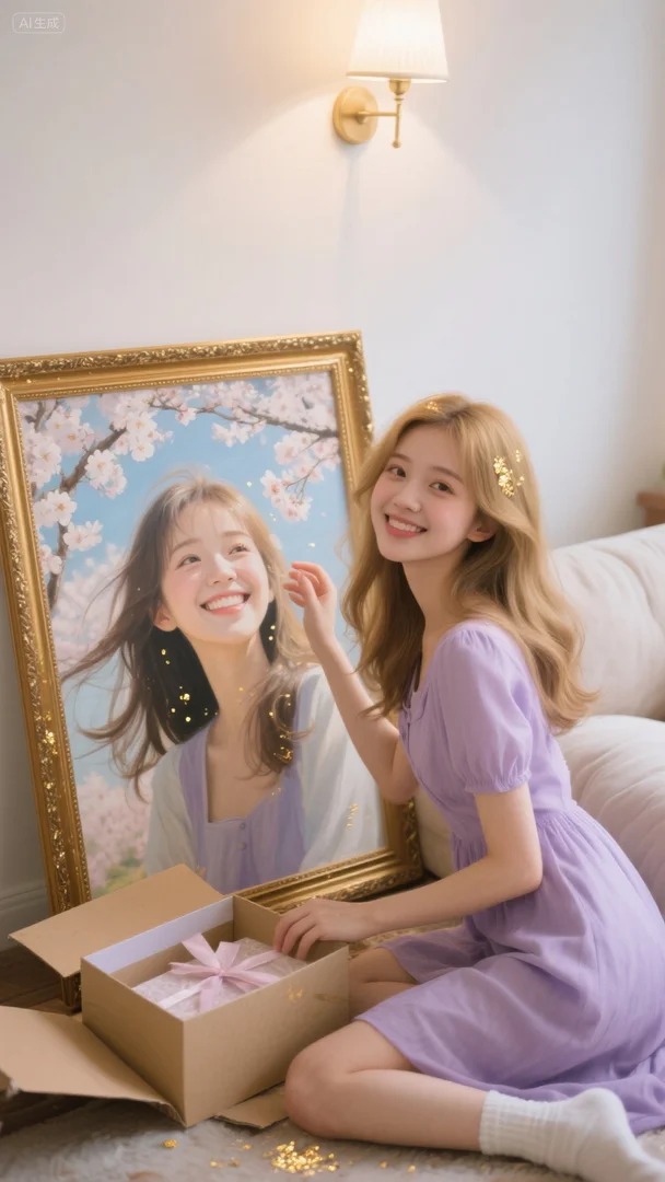 亚麻金中长发散在肩头,发梢沾着拆画框时蹭的金粉。美少女穿着淡紫连衣裙跪坐在懒人沙发上,面前拆开的礼盒里躺着一幅油画——是她去年在樱花树下抬头笑的样子,连发梢被风吹起的弧度都分毫不差。暖白壁灯在头顶洒下,画框边缘的鎏金在她发间闪着光,她抬手轻轻碰了碰画中自己的脸,眼睛弯成两弯月牙,连睫毛都在颤抖——原来被用心记住的样子,比任何滤镜都美。