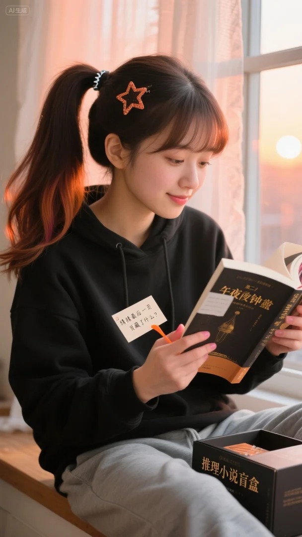 深棕挑染发尾的高马尾用鲨鱼夹夹起,发间别着枚星星发夹(和收到的礼物同色)。美少女穿着黑色卫衣配灰色运动裤,坐在飘窗上拆朋友寄来的「推理小说盲盒」。她刚抽出第三本《午夜钟摆》,书脊上的烫金在暖光里闪着细闪,书里还夹着张手写便签:“猜猜最后一页藏了什么?”。窗外的夕阳漏进纱帘,在她手背镀了层橘粉,睫毛随着翻书的动作轻颤,连嘴角都压不住地上扬。