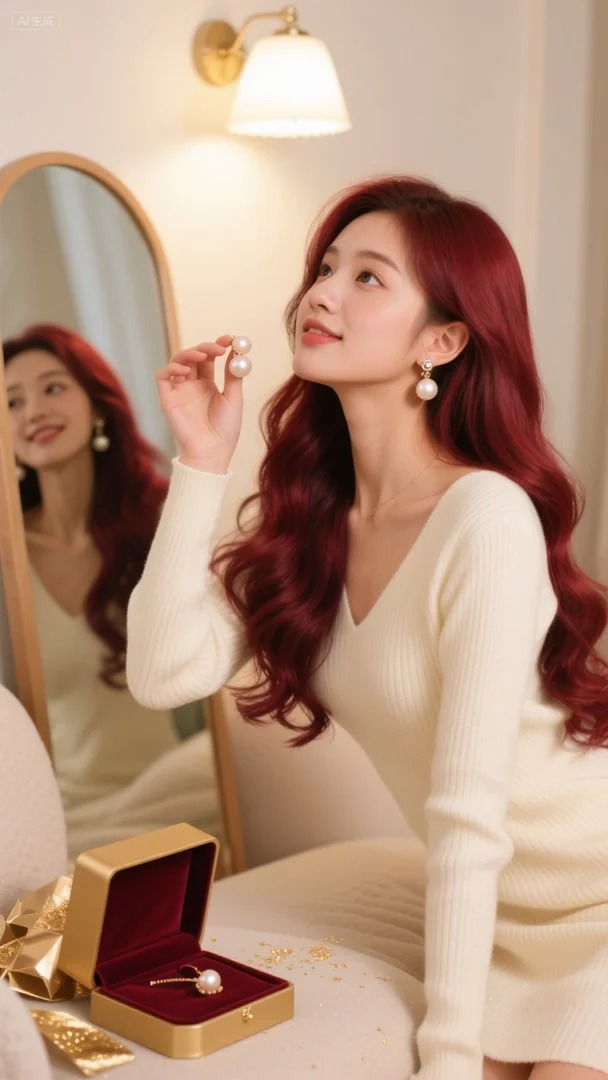酒红色大波浪垂到腰际,发尾沾着拆包装纸时蹭的金粉(礼盒是鎏金款)。美少女穿着米白针织裙跪坐在懒人沙发上,面前摆着刚拆开的丝绒首饰盒。她右手捏着一对珍珠耳坠,指尖轻轻碰了碰珠子表面——光泽像晨露落在花瓣上。暖白壁灯从头顶洒下,耳坠在她颈侧投下小小的影子,她仰头看镜子里戴耳坠的自己,眼睛弯成两弯月牙,连头发丝都泛着温柔的光。