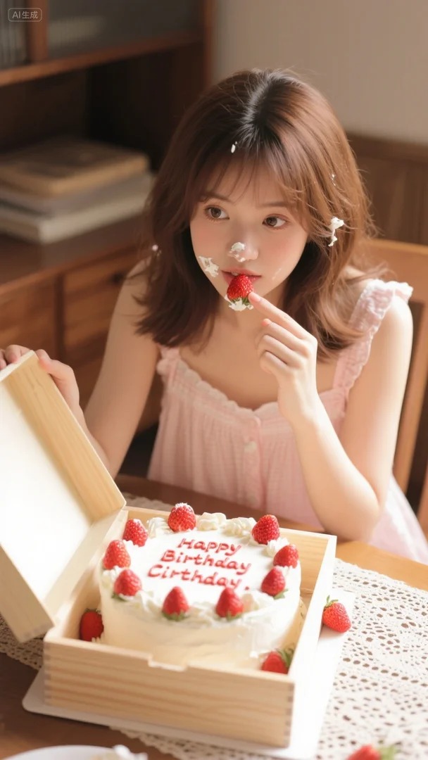 蜜茶色中长发散在肩头,发梢沾着奶油渍(拆蛋糕盒时蹭的)。美少女穿着淡粉棉质睡裙坐在餐桌前,面前摆着刚拆开的木质蛋糕盒。她掀开盒盖的瞬间,草莓香混着暖光涌出来——蛋糕表面挤着歪歪扭扭的「生日快乐」,周围缀满新鲜草莓。她左手托着蛋糕盒,右手食指戳了戳最顶端的草莓,鼻尖几乎要碰到奶油,眼睛亮得像星星,连嘴角都沾了点奶油沫。