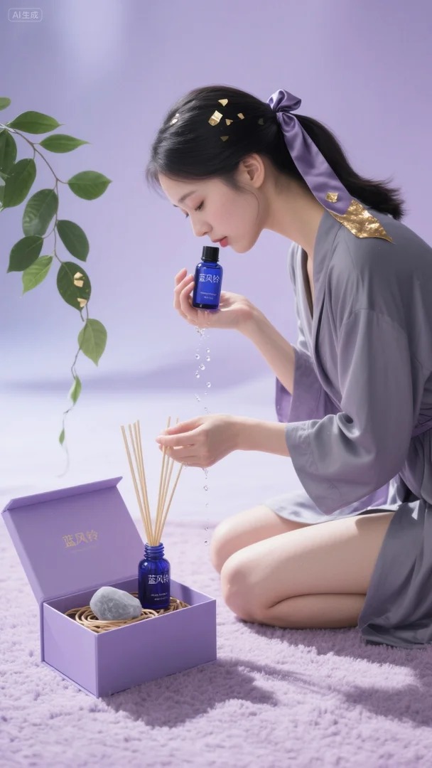 深灰色低马尾用丝绸发带绑着,发带边缘沾着包装纸的金箔碎屑。美少女穿着浅紫睡袍跪在地毯上,面前拆开的礼盒里躺着藤条扩香石和两瓶香薰精油。她刚把「蓝风铃」精油倒在手背上轻嗅,清甜的味道混着暖光漫开。她右手捏着精油瓶,左手轻轻碰了碰藤条——水珠顺着藤条滑落,在木质盒底溅起小水花。墙角的绿植叶子垂下来,在她脚边投下斑驳的影子,连呼吸都跟着慢了半拍。