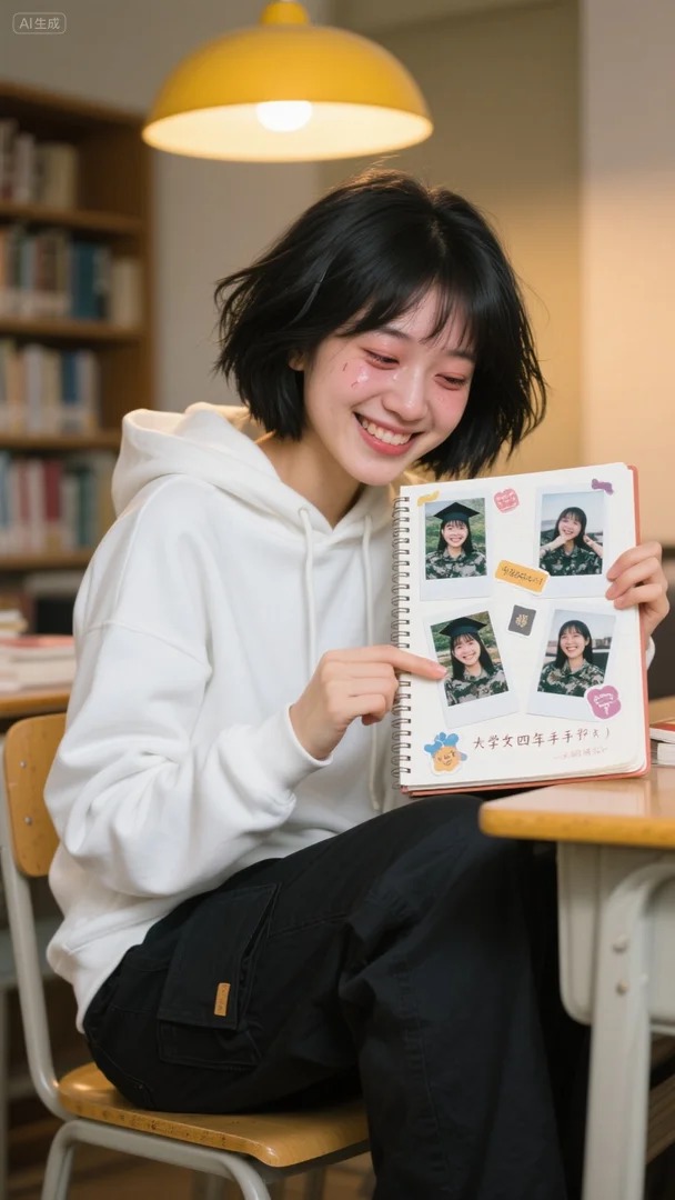 黑色短发用发蜡抓出蓬松感,额前几缕碎发粘在汗湿的额角(拆得太激动)。美少女穿着白色连帽卫衣配黑色工装裤,坐在书桌前拆闺蜜寄来的「大学四年手账本」。她刚翻开第一页,贴满了两人的合照:军训时的汗脸、图书馆的偷拍、毕业照的搞怪。暖黄顶灯从上方直射,她的手指抚过照片边缘的贴纸,眼睛微微发红却笑得灿烂,连睫毛都在颤抖——原来被记得的感觉,比任何礼物都珍贵。