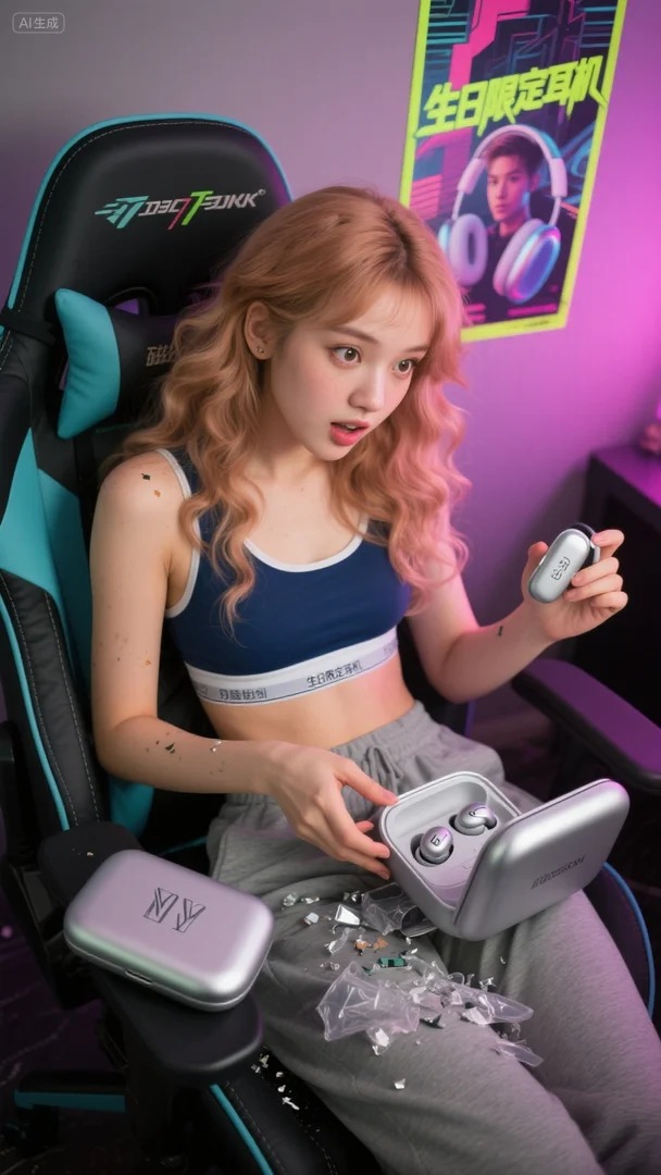浅栗色波浪卷发垂到肩头,发尾沾着拆耳机盒时蹭的塑料碎屑。美少女穿着藏青运动背心配灰色运动裤,坐在电竞椅上拆男友送的「生日限定耳机」。她刚掀开磁吸盒盖,银色耳机在暖光里泛着金属光泽,充电仓上还刻着两人的名字缩写。她右手捏着耳机柄,左手轻轻碰了碰触控区——灯光亮起的瞬间,她眼睛突然睁大,嘴角扬起的小弧度比耳机还酷。椅背后的墙上贴着游戏海报,和她耳机的荧光色刚好撞色。