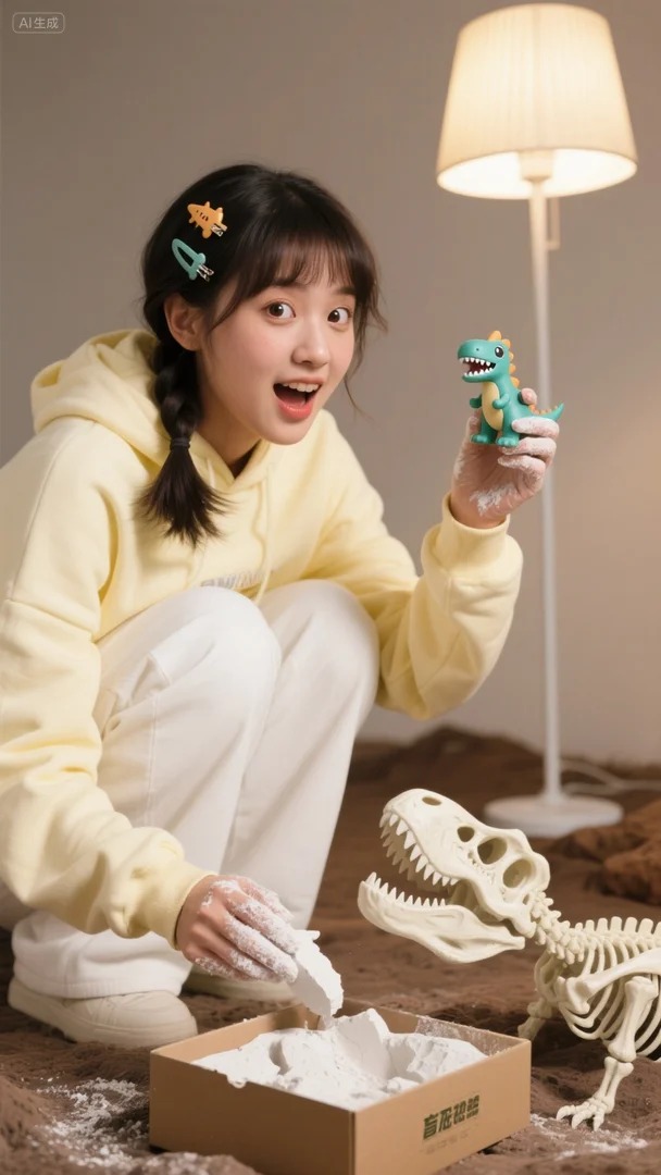米白色低马尾用鲨鱼夹夹起,发间别着枚小恐龙发夹(和盲盒主题同款)。美少女穿着黄色卫衣配白色阔腿裤,蹲在地上拆「恐龙考古盲盒」。她刚敲开石膏层,露出半只完整的霸王龙骨架,连牙齿的纹路都清晰可见。暖白落地灯从侧面打光,石膏粉在她指尖沾成白霜,她举着公仔的手微微发抖,眼睛瞪得圆圆的,连头发丝都因为激动翘成了小呆毛。