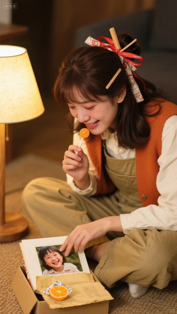 深茶色中长发用木簪松松挽起,发间缠着几缕包装纸的红丝带(拆太急没扯干净)。美少女穿着卡其工装裤配橙色马甲,坐在地毯上拆奶奶寄来的「童年回忆相册」。她刚翻开第一页,夹着张泛黄的糖纸——是她小时候最爱的橘子糖。暖黄台灯在她身侧投下柔和的光,她的手指抚过照片里自己啃糖的歪嘴笑,眼眶微微发红却笑得像个孩子,连嘴角的梨涡都漾起来了。