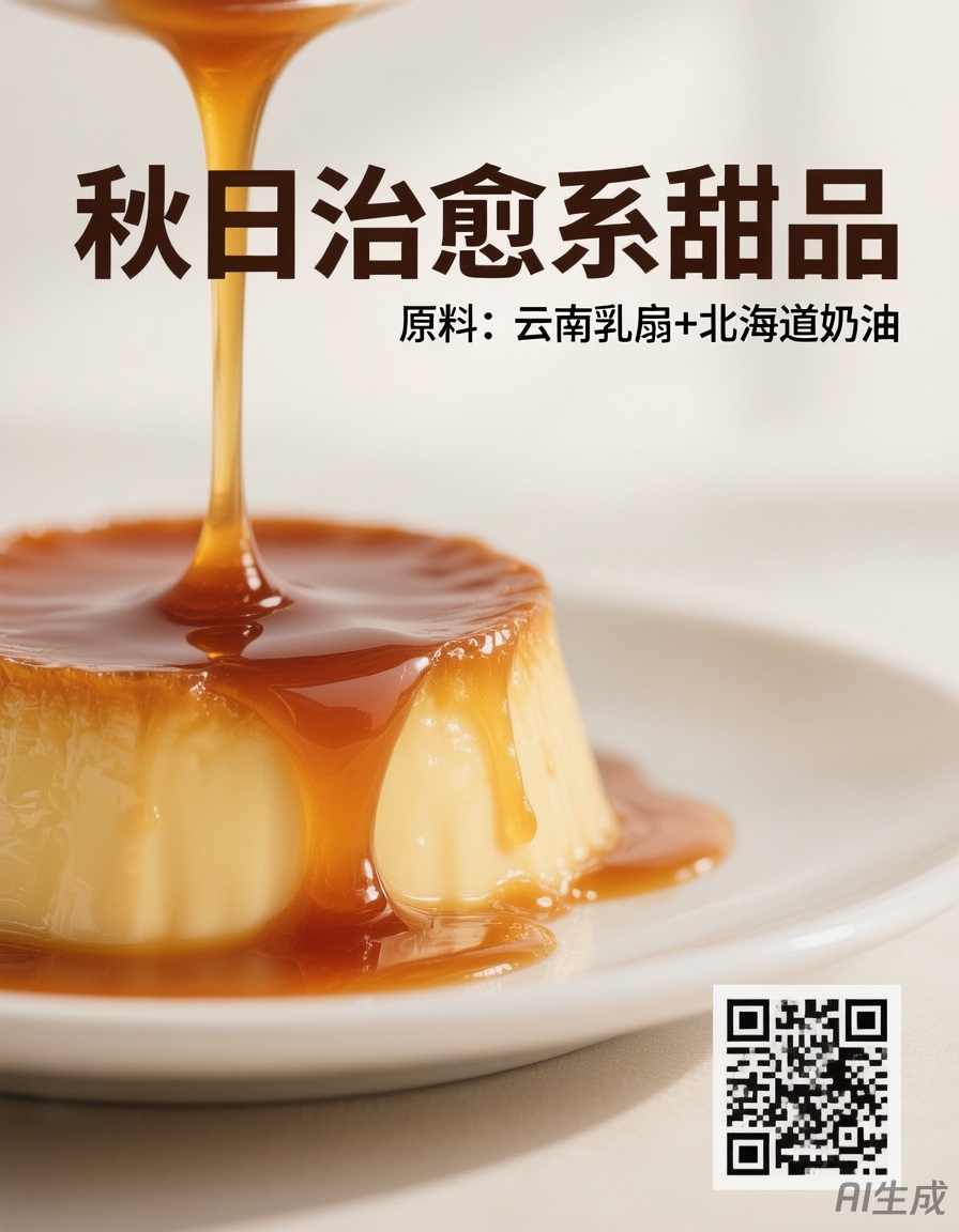 提示词:小红书风格美食海报:底图特写焦糖布丁流淌的酱汁,文字排版:包含”秋日治愈系甜品”主标题(思源黑体加粗)、”原料:云南乳扇+北海道奶油”副标题(微软雅黑常规),底部添加购买二维码占位符。
