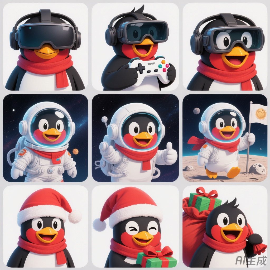 提示词:基于腾讯QQ企鹅生成九宫格表情包:1-3格展示企鹅戴VR眼镜打游戏的场景,4-6格呈现太空漫步造型,7-9格设计圣诞老人企鹅变装,要求保留标志性红围巾。