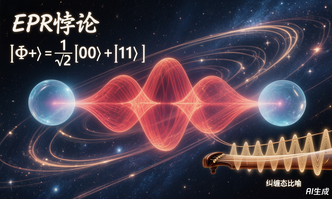 提示词:生成一幅插画,解释量子纠缠现象:两个粒子通过红色能量波连接,背景为星空与粒子轨迹,左侧用公式标注EPR悖论,右侧展示中国古琴弦比喻纠缠态。