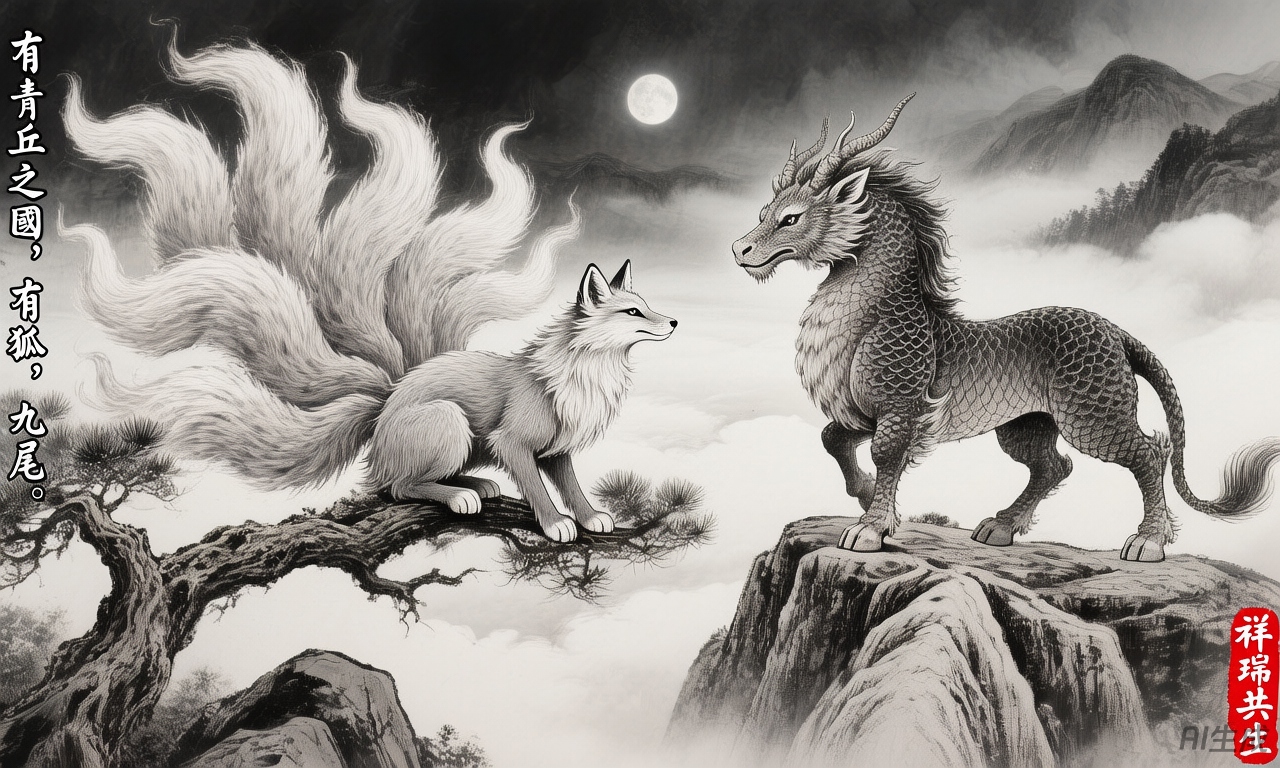 提示词:创作一幅水墨风格插画,展现《山海经》中九尾狐与麒麟对话的场景,画面左上角题写《大荒东经》原文节选,右下角用篆书标注”祥瑞共生”。