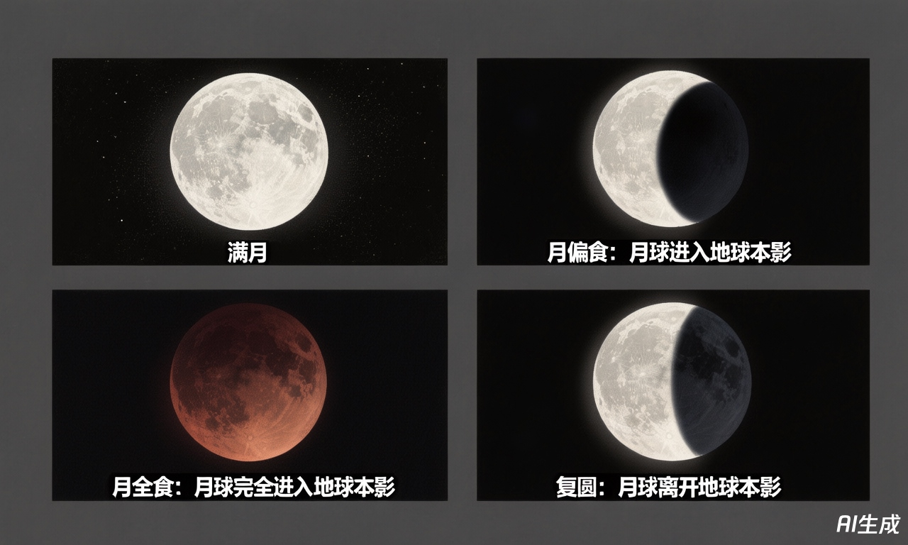 提示词:制作一个月全食四格科普漫画:第一格满月,第二格月食初现,第三格食甚阶段,第四格复圆,每格包含天文现象示意图和简明文字说明。