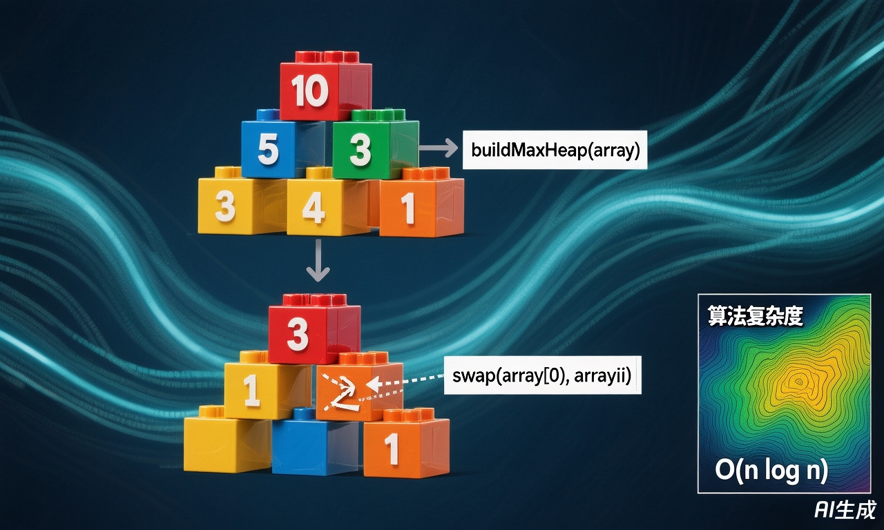 提示词:生成堆排序算法流程图:用乐高积木块动态演示元素交换过程,每个步骤标注伪代码,背景添加流动数据线,右下角用等高线地图展示算法复杂度。