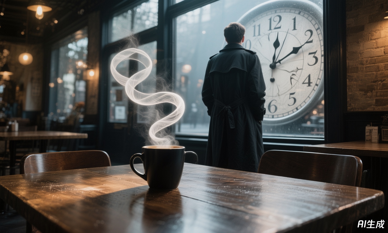 提示词:电影画面,暗黑风格咖啡厅内,穿黑色风衣的男主背对镜头凝视窗外,窗框投影出扭曲的时钟倒影,桌面咖啡杯升起热气形成莫比乌斯环,镜头使用24mm广角+浅景深。