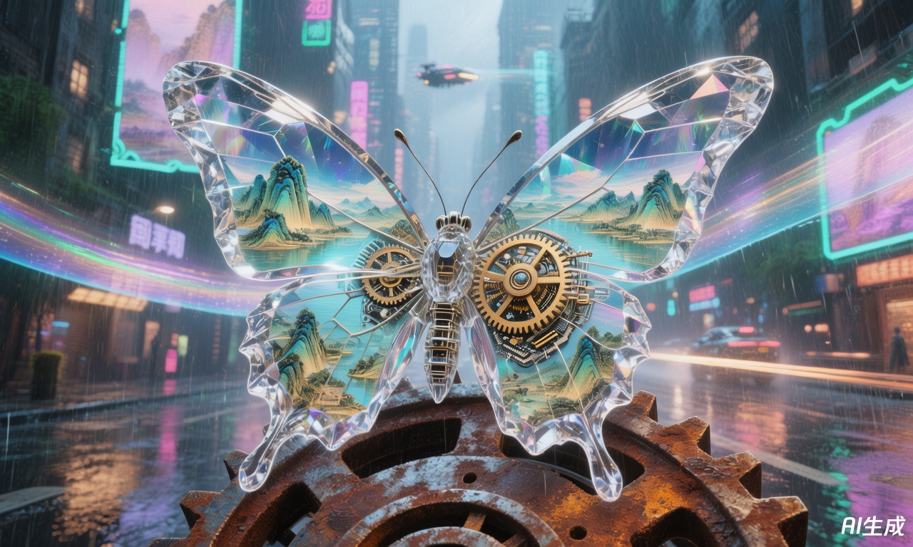 提示词:3D渲染风格:透明水晶材质的机械蝴蝶停驻在生锈齿轮上,翅膀折射出全息投影的《千里江山图》,背景为赛博朋克雨夜街道,添加镜头光晕与运动模糊。