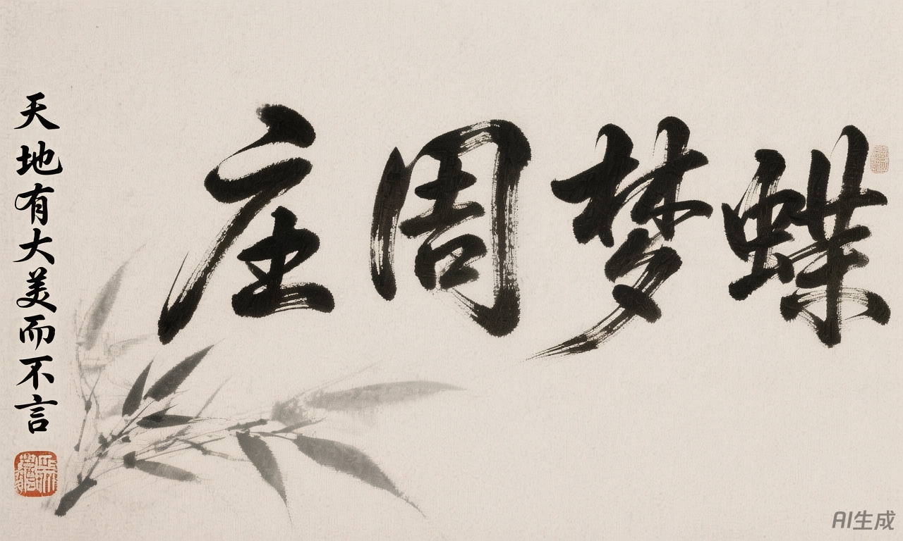 提示词:创作书法横幅:左侧用瘦金体书写”天地有大美而不言”,右侧用狂草题写”庄周梦蝶”,底部添加朱砂印章与水墨竹叶装饰,背景为宣纸纹理。
